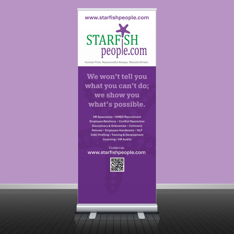 The key with a roller banner itself is keeping the message simple. People rarely stop to read lots of text, so the design needs to communicate quickly. A strong headline, a clear visual and visible contact details will do far more work than paragraphs of explanation.